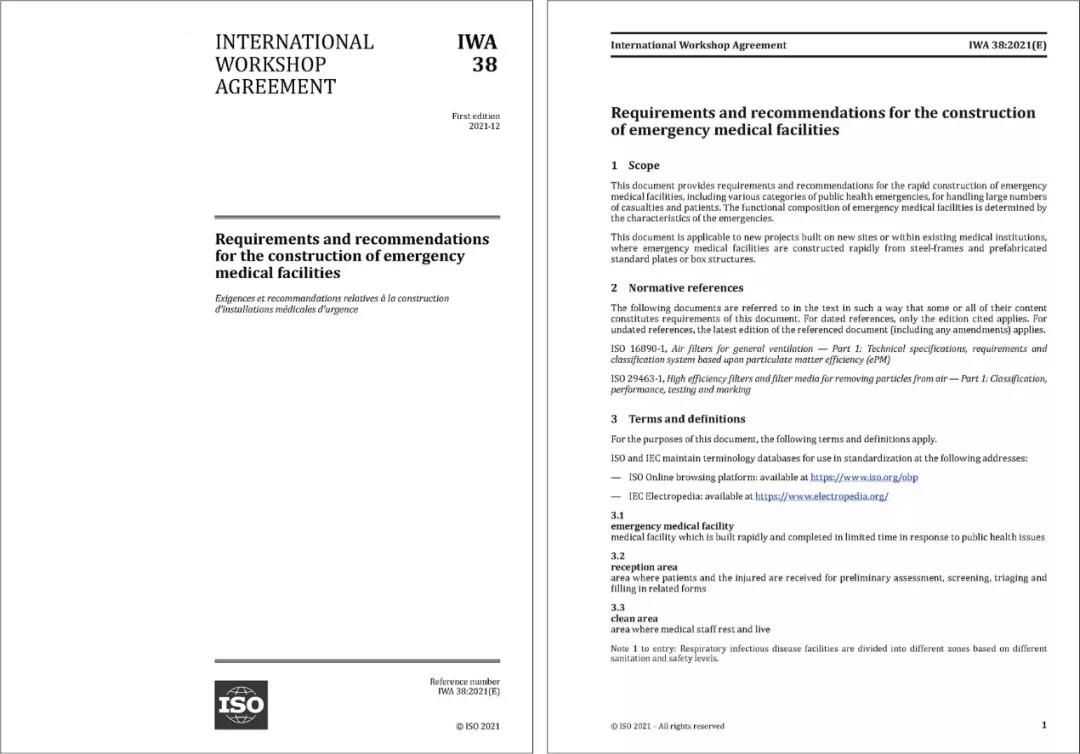 在此新冠肺炎疫情持續(xù)蔓延、亟待國際合作共同抗擊疫情之際,IWA 38《應急醫(yī)療設施建設導則》作為ISO應對新冠肺炎疫情的系列標準之一先行發(fā)布,為世界各國安全、適用、快速建設應急醫(yī)療設施提供了有力的技術支持,為中國乃至世界人類健康事業(yè)作出了巨大的貢獻。
